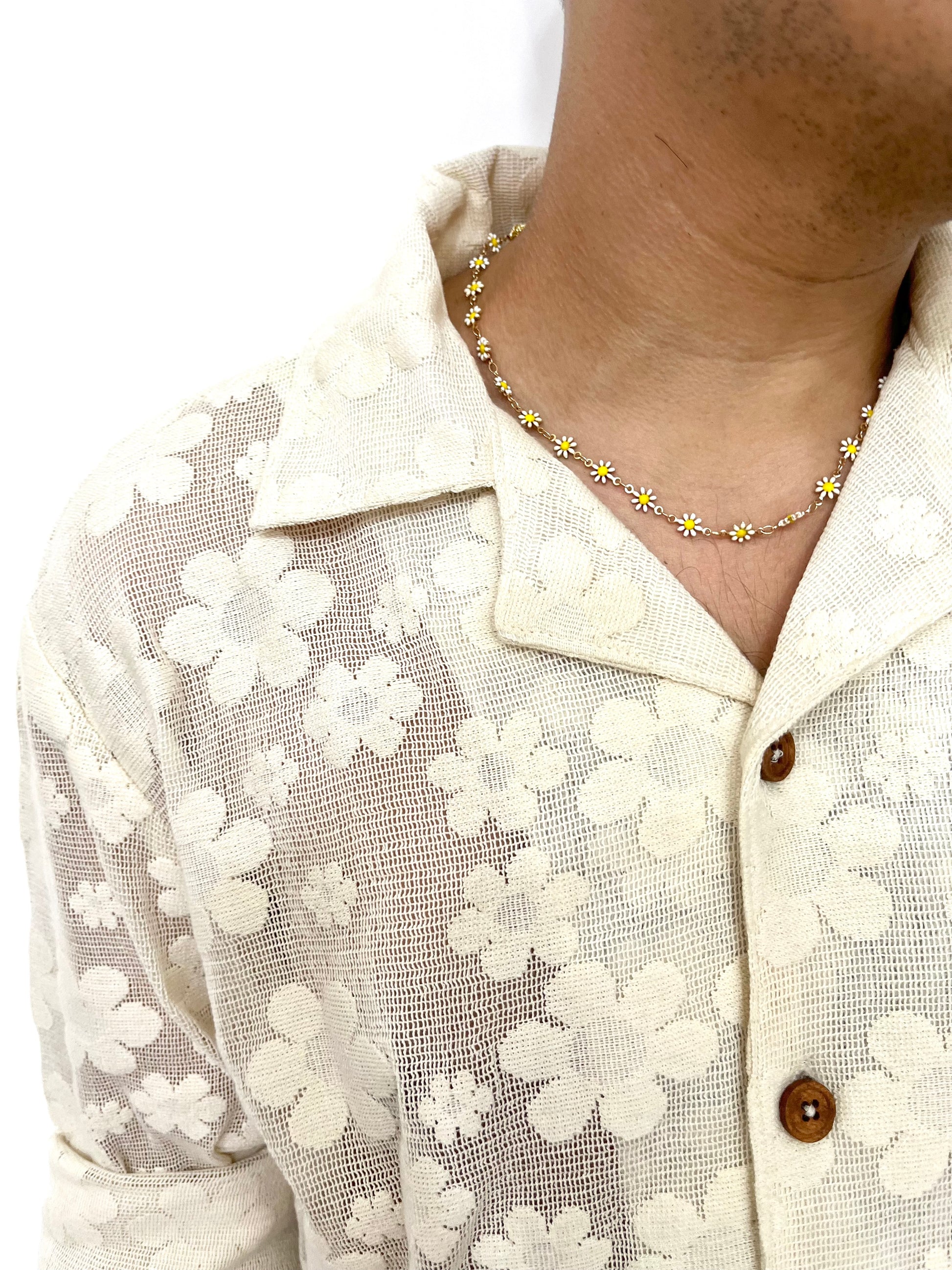 What makes this piece truly special is the delicate daisy pattern subtly woven into the fabric. Rather than printed on, the floral detailing is part of the textile itself, creating a textured finish that’s both tactile and visually interesting.