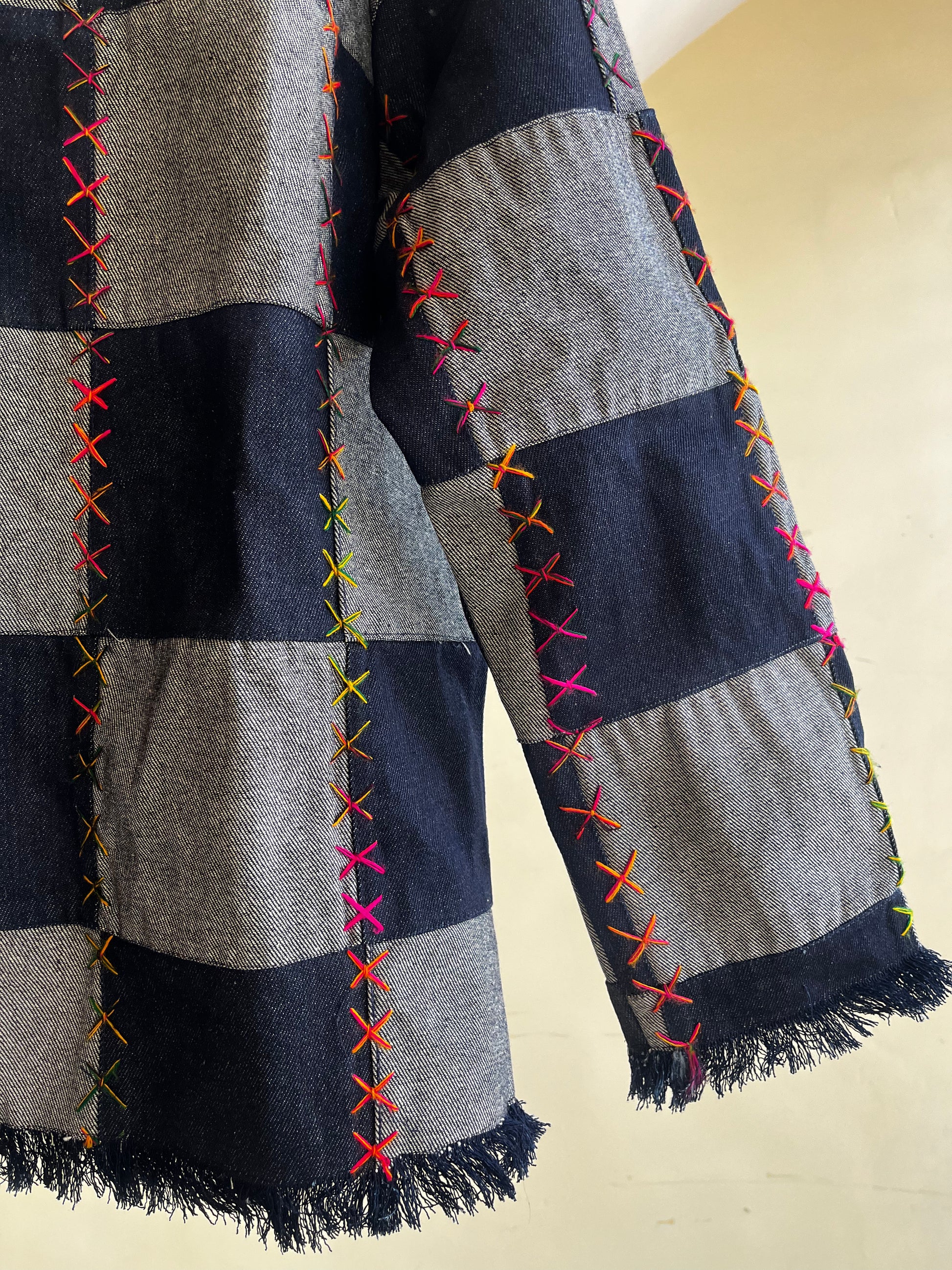 This jacket started as leftover denim pieces that deserved a second life. Instead of discarding them, they were reworked, patched together with contrasting light and dark denim patches one after another, creating an interesting pattern.