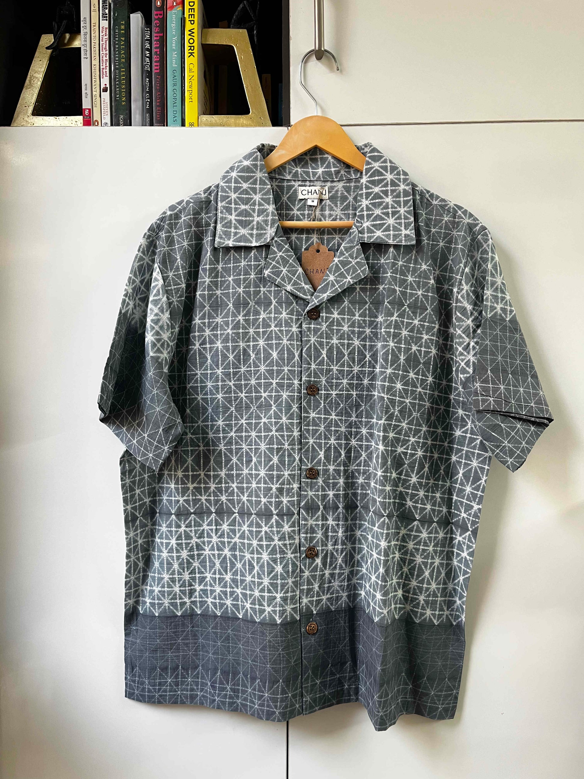 Defined by clean geometry and subtle contrast, this shirt features a Shibori-inspired print laid out in a fine grid pattern. The muted grey tone gives it a calm, balanced feel; structured yet easy!