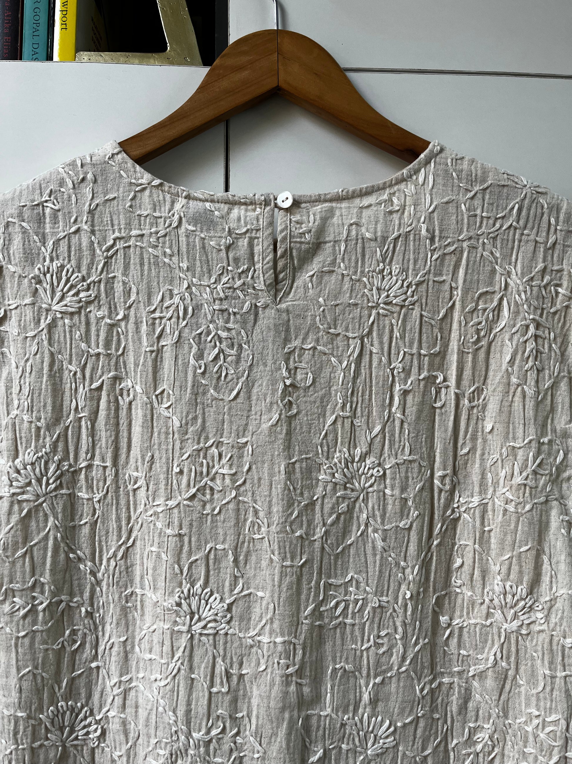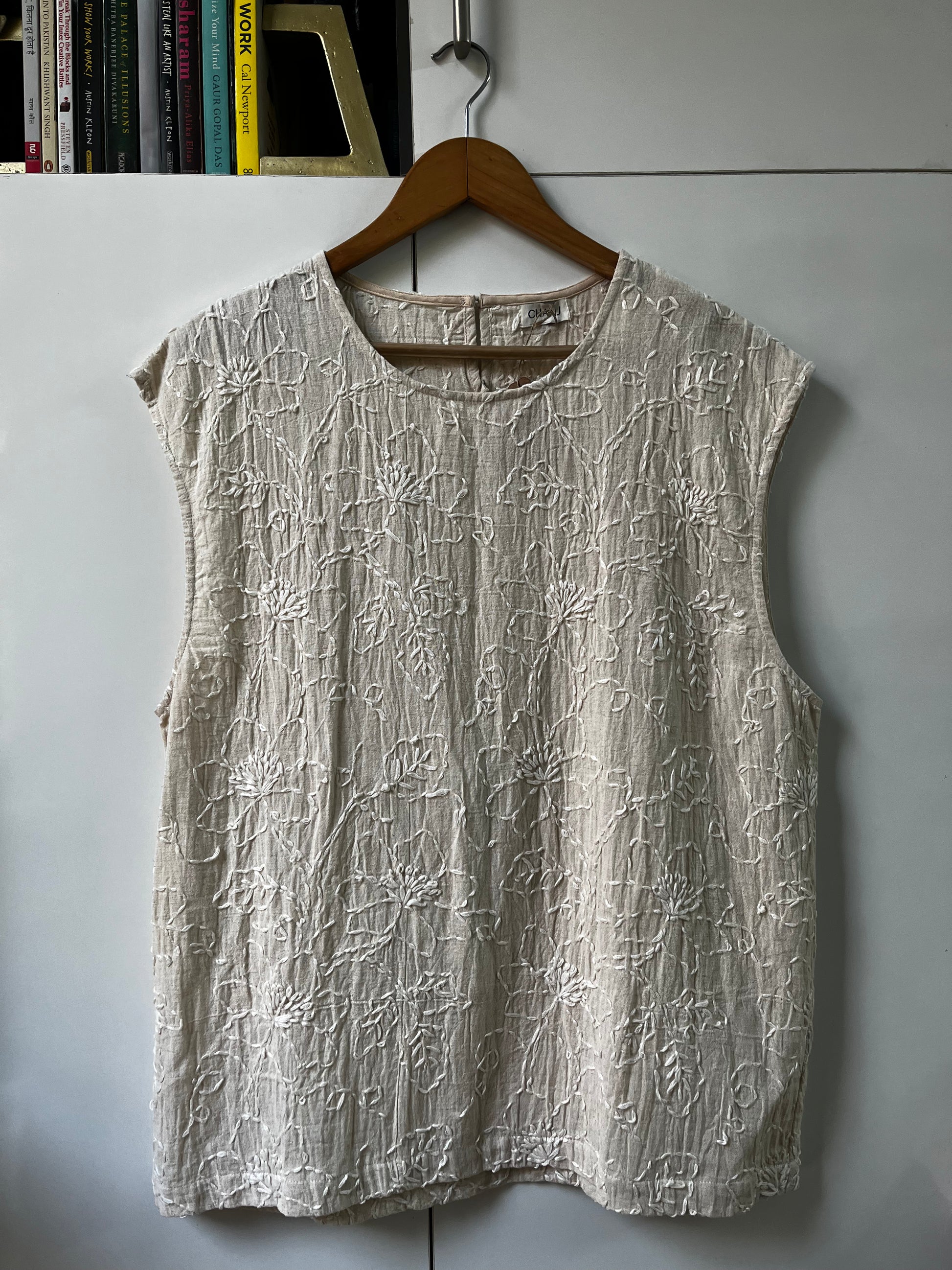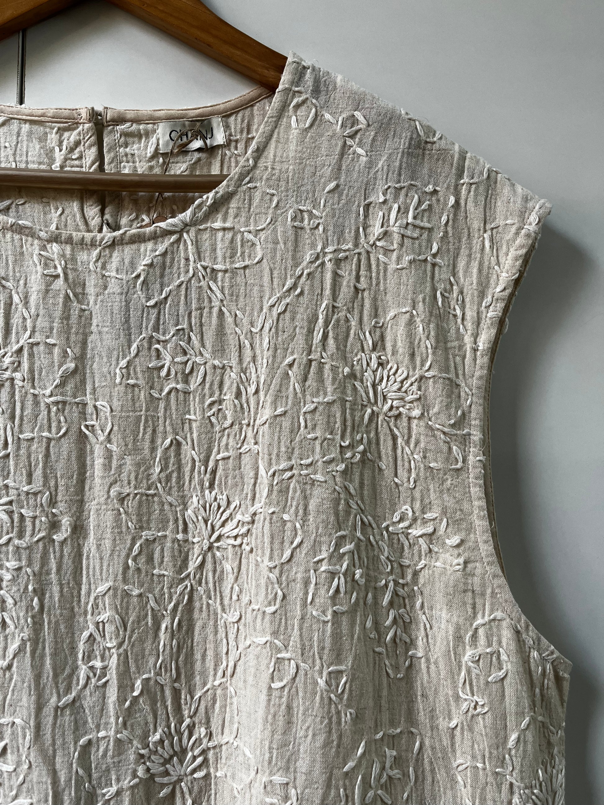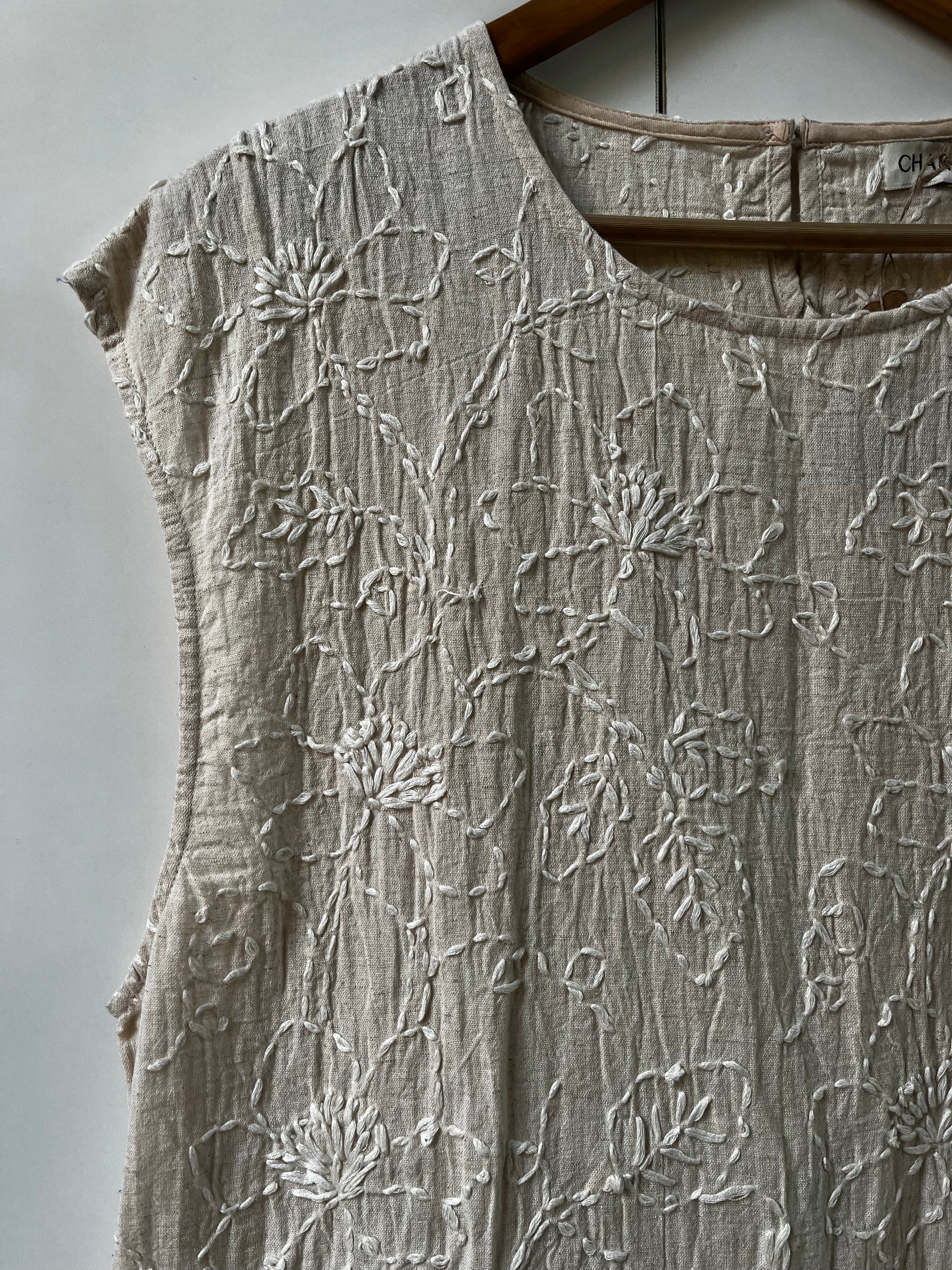 An over-sized tank featuring all-over hand embroidery on a light-weight cotton base. The subtle floral embroidery adds quiet character while keeping the piece versatile and timeless!