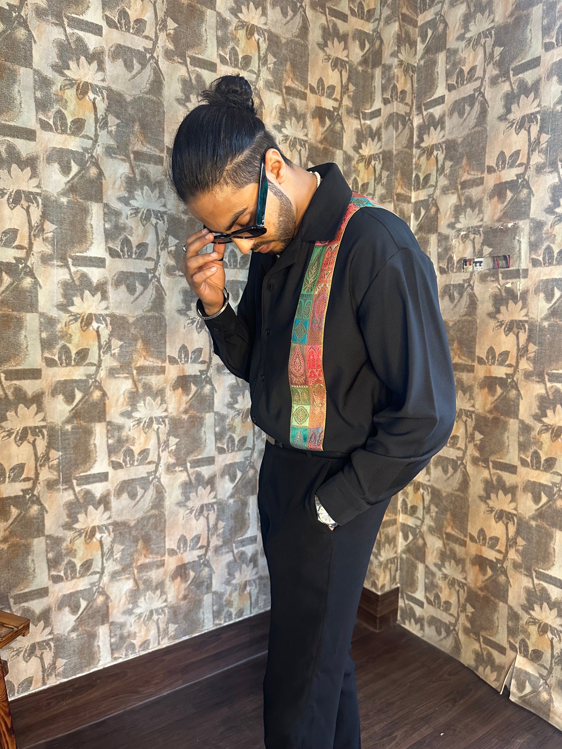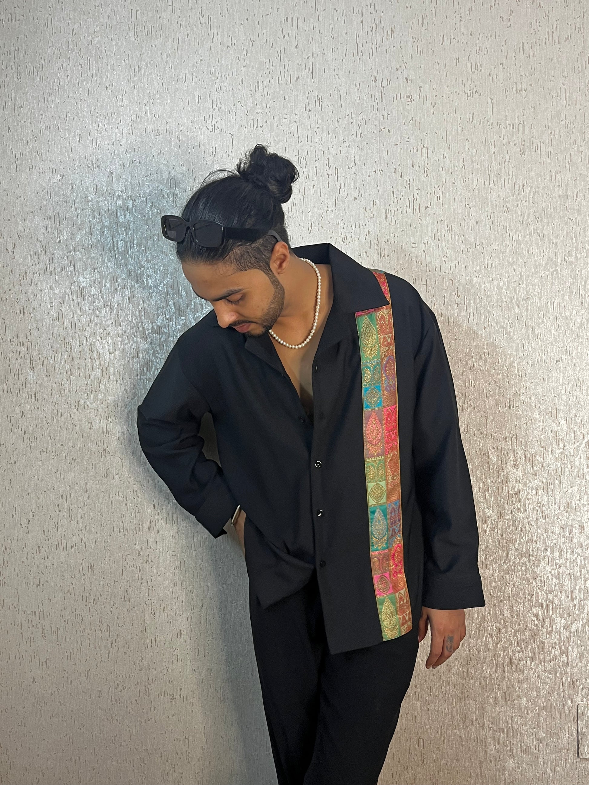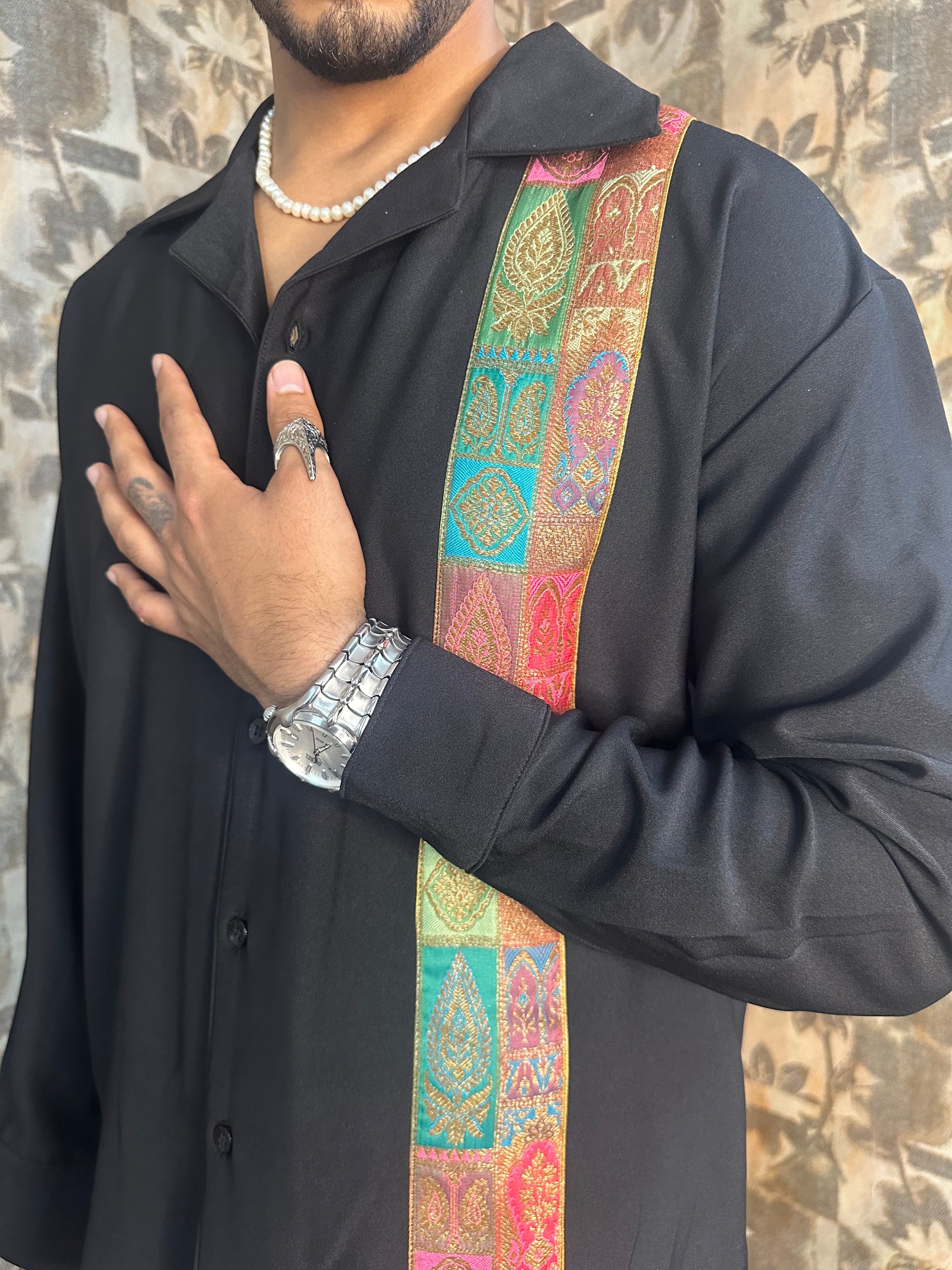 It’s a black shirt but with a twist, the revere collar and carefully crafted brocade patch makes the shirt look alluring! The shirt has a straight hem which makes it easy to style! It’s perfect for almost any kind of occasion.