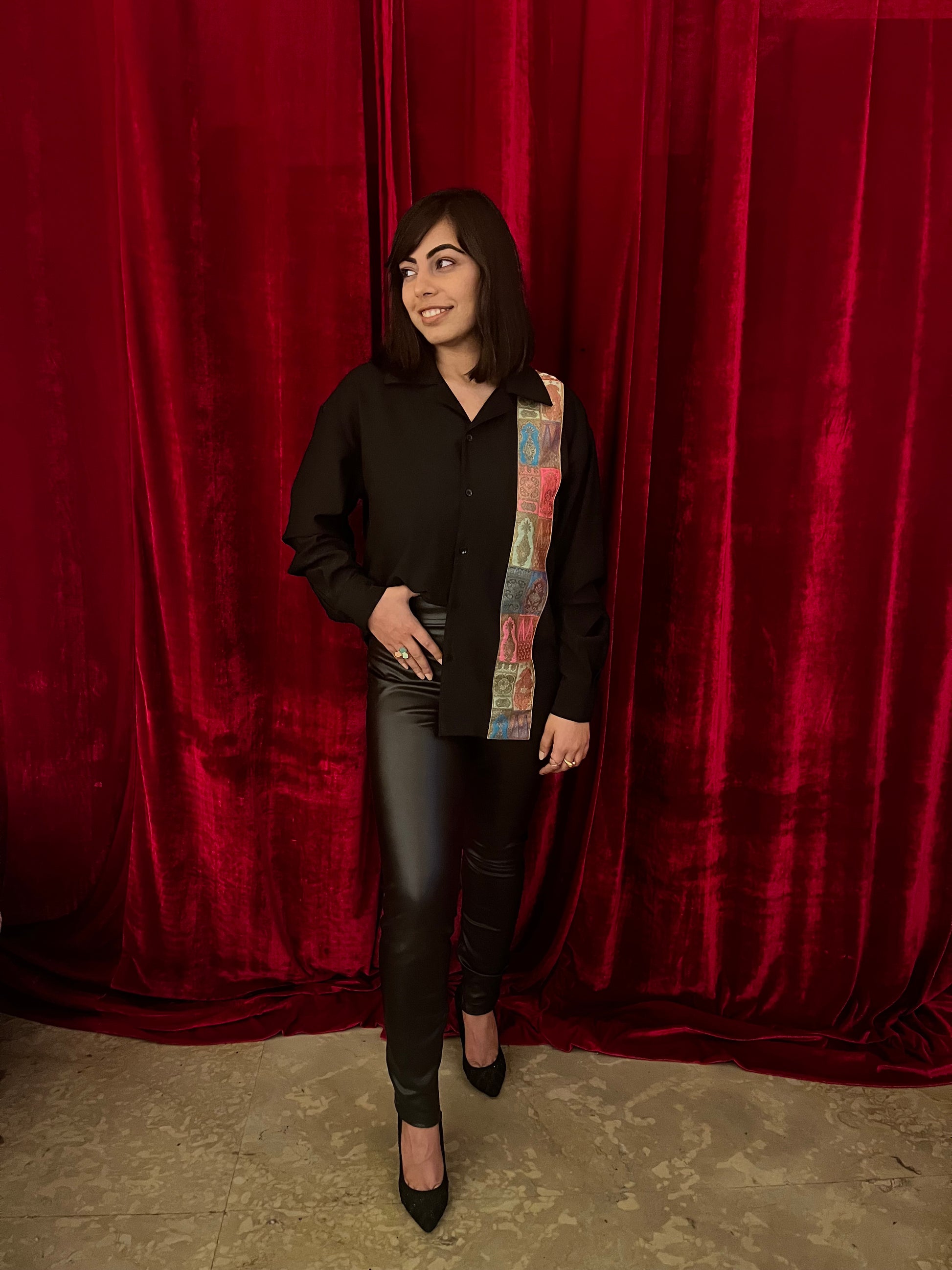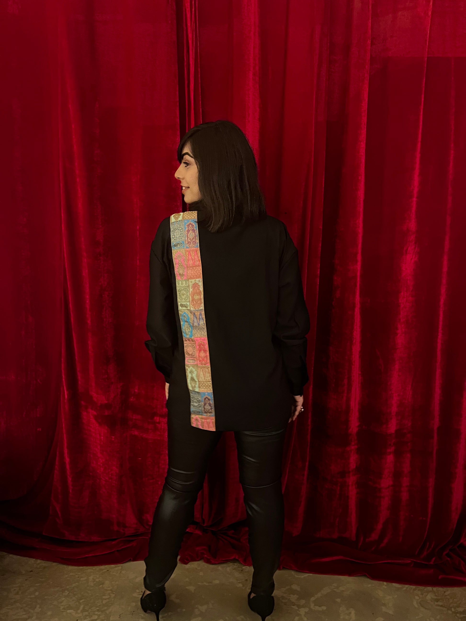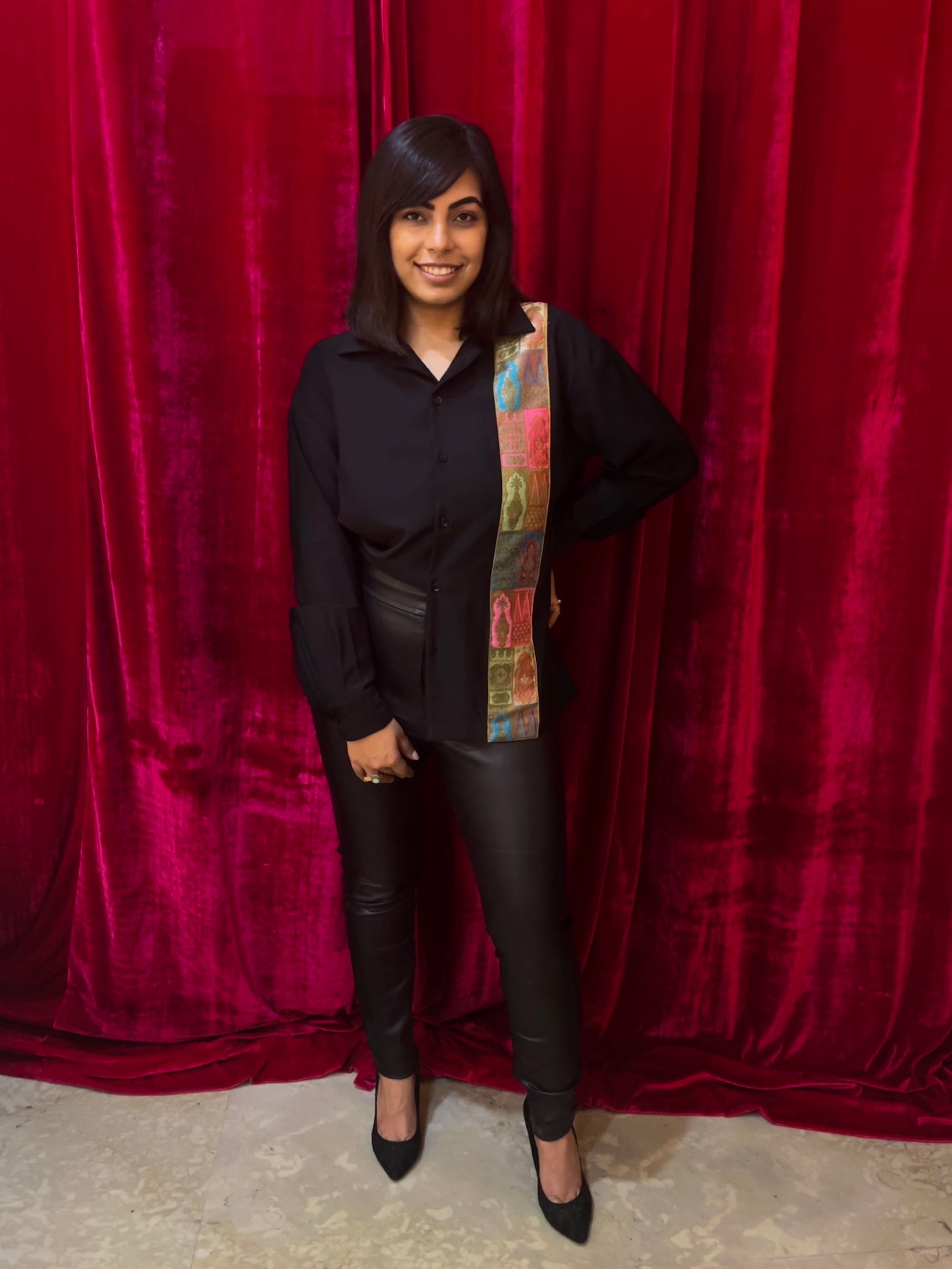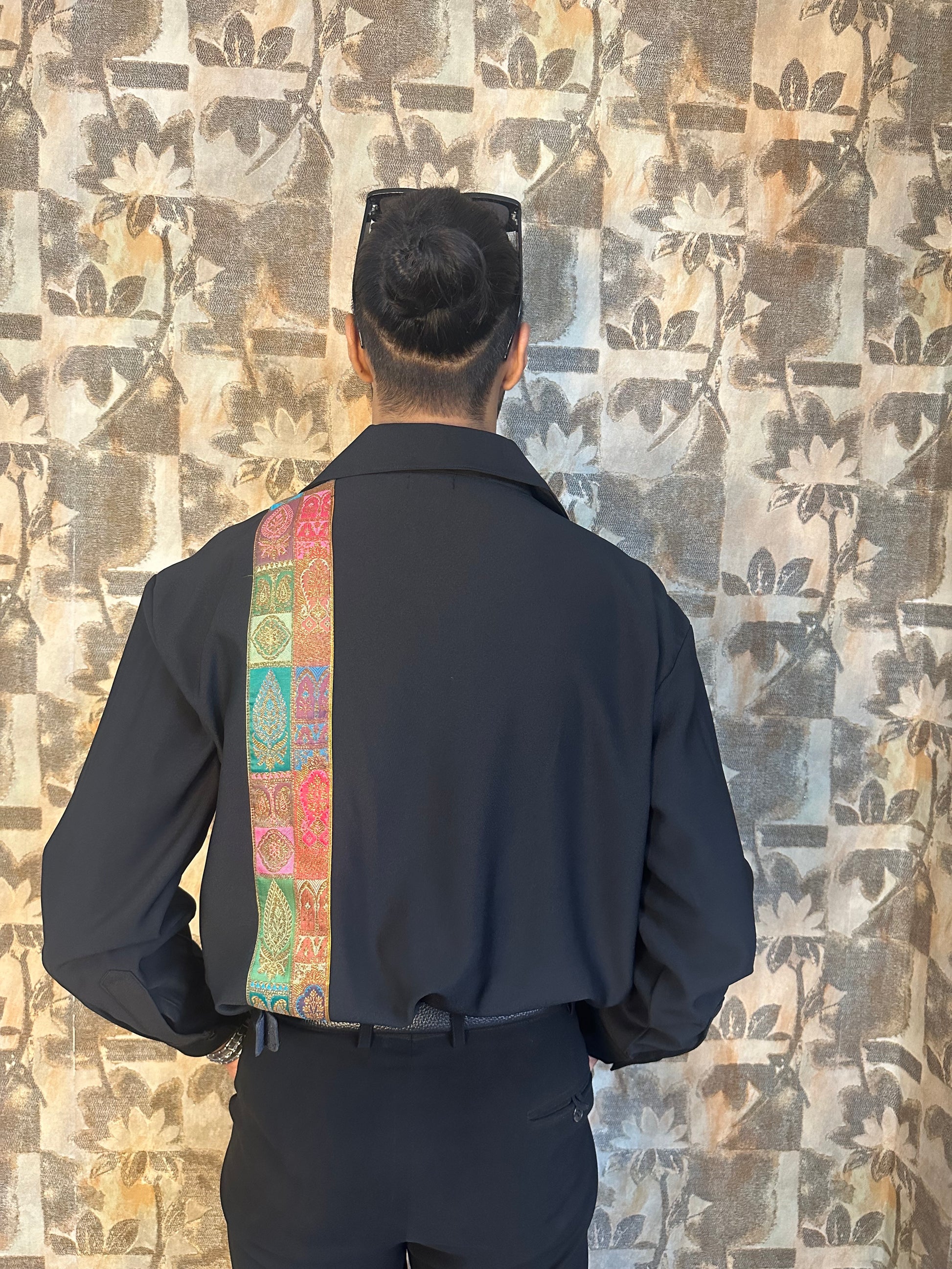 It’s a black shirt but with a twist, the revere collar and carefully crafted brocade patch makes the shirt look alluring! The shirt has a straight hem which makes it easy to style! It’s perfect for almost any kind of occasion.