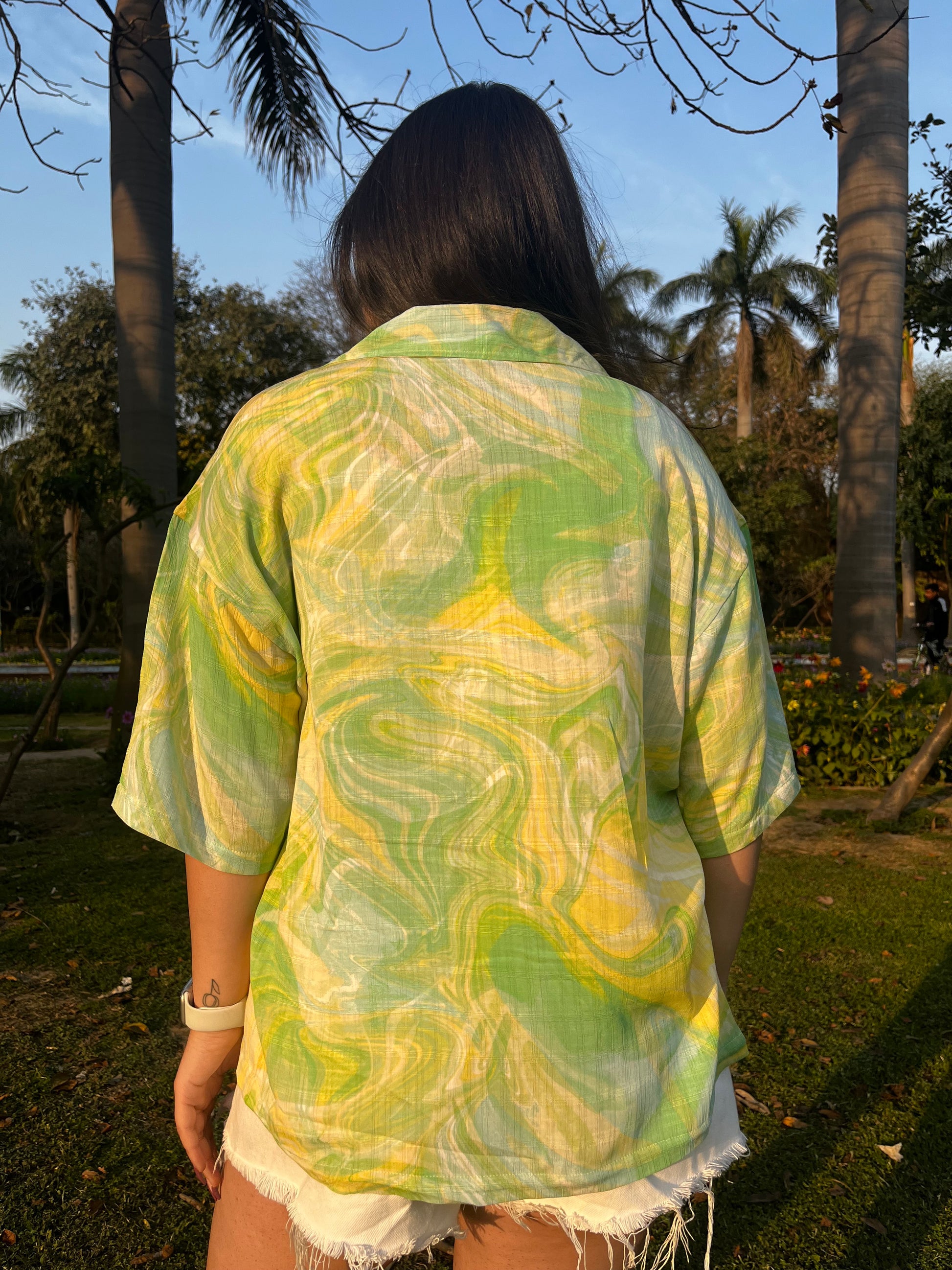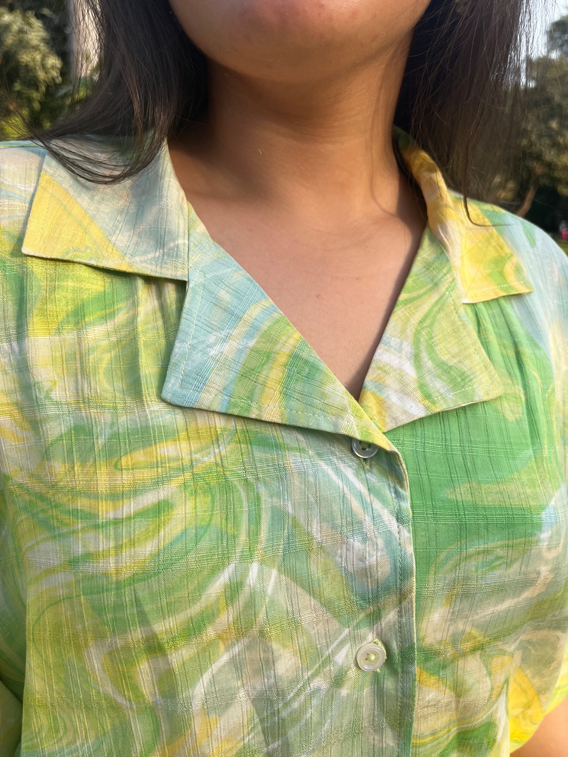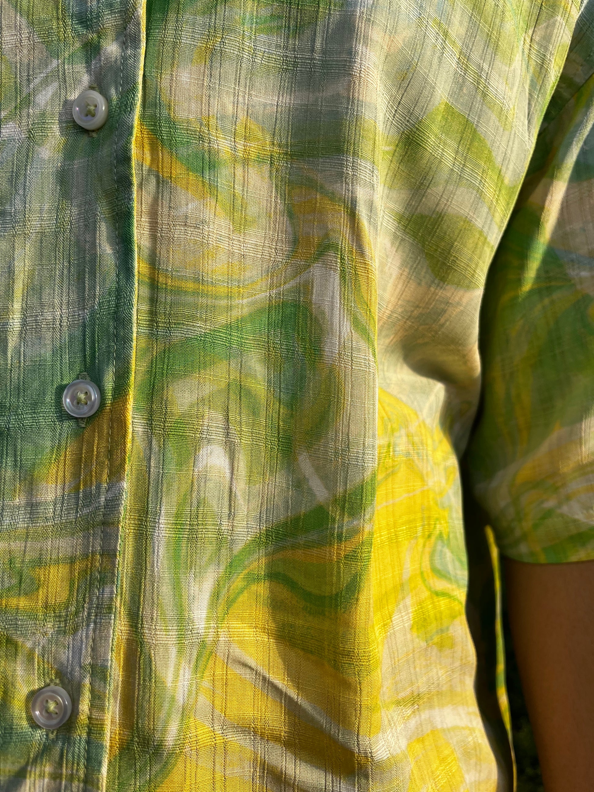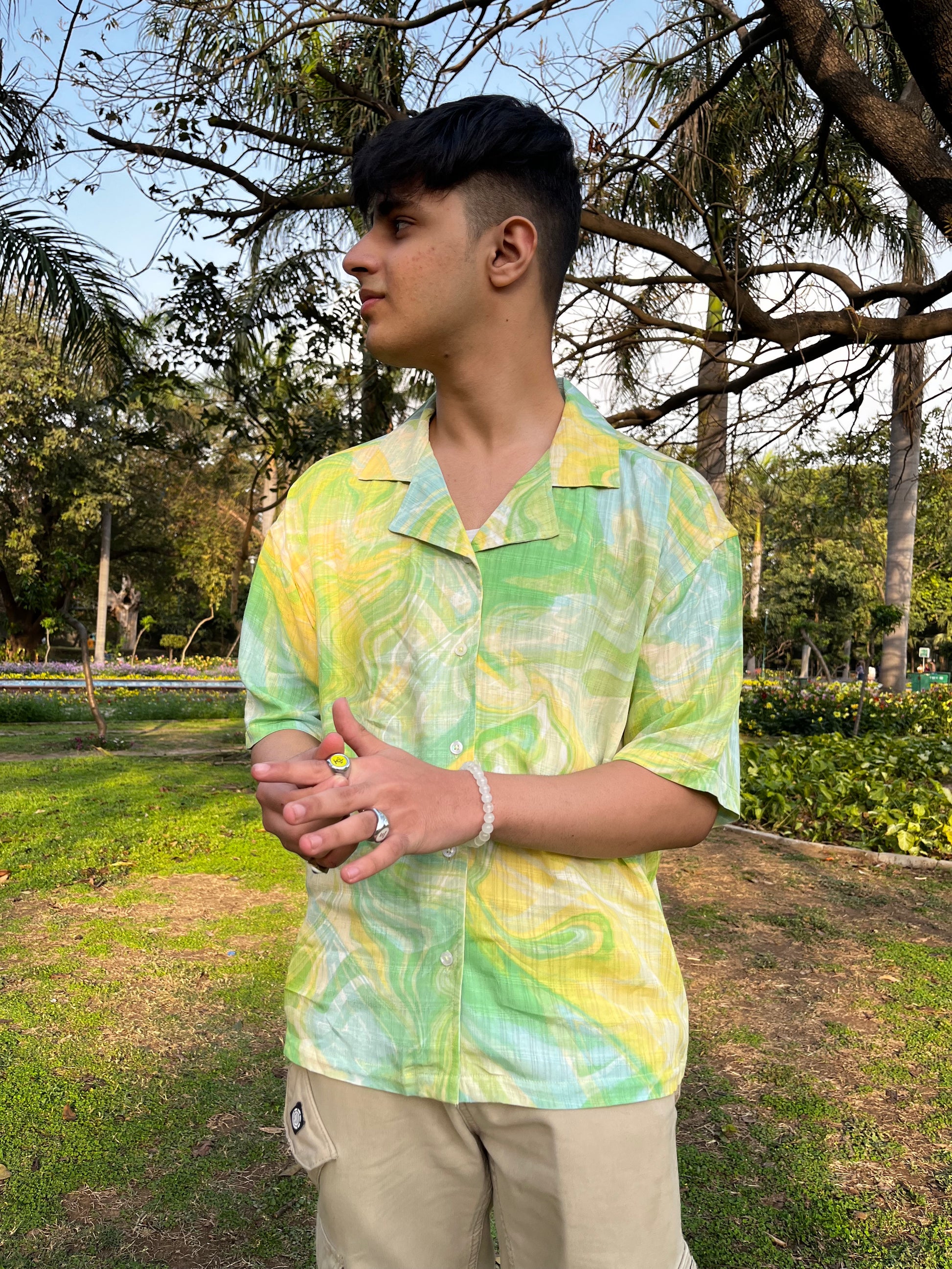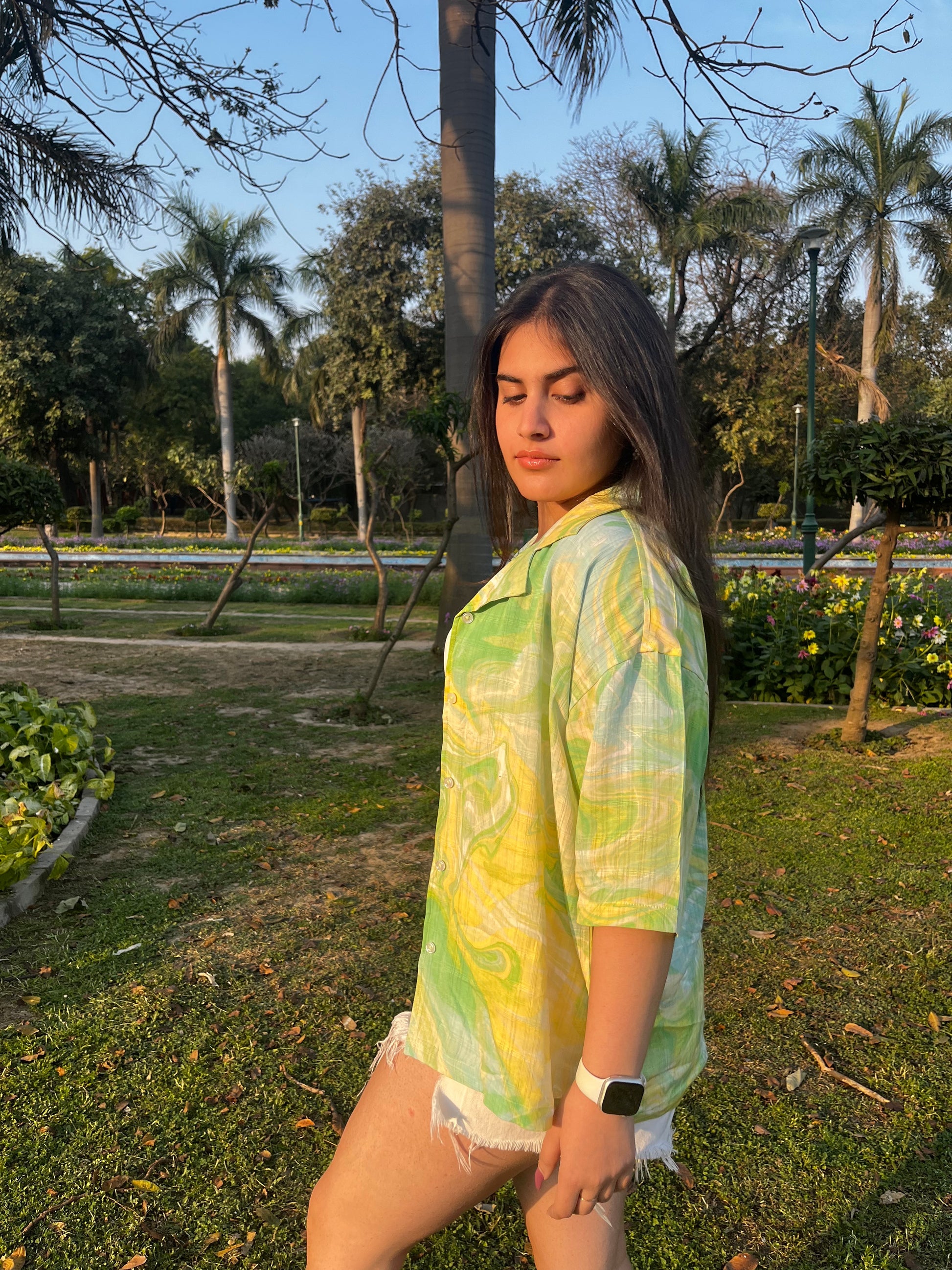 The shirt has bright and soothing marble print in shades of yellow and green; the resort collar with button down feature makes it perfect for your next vacation wear!
