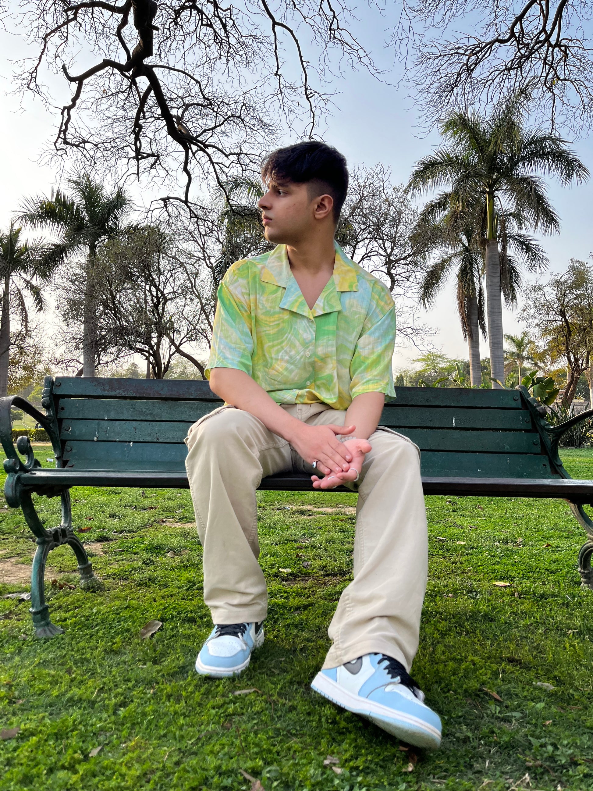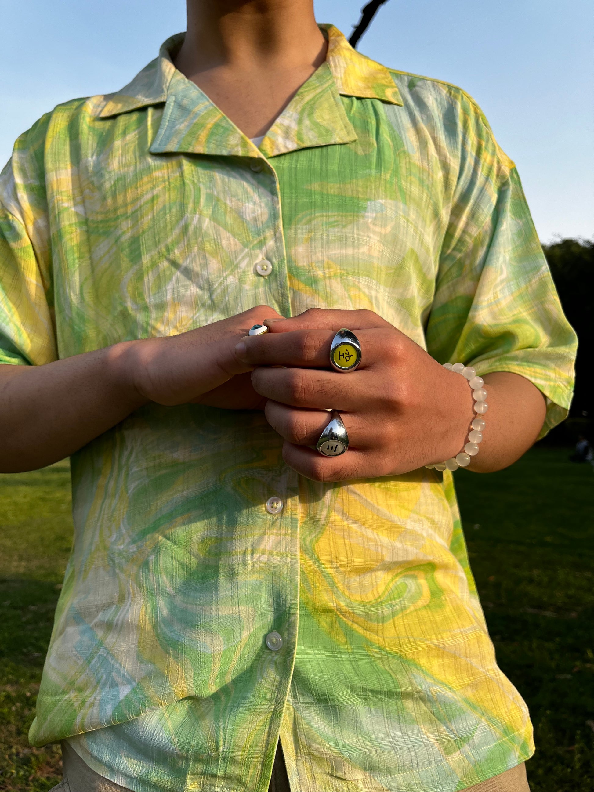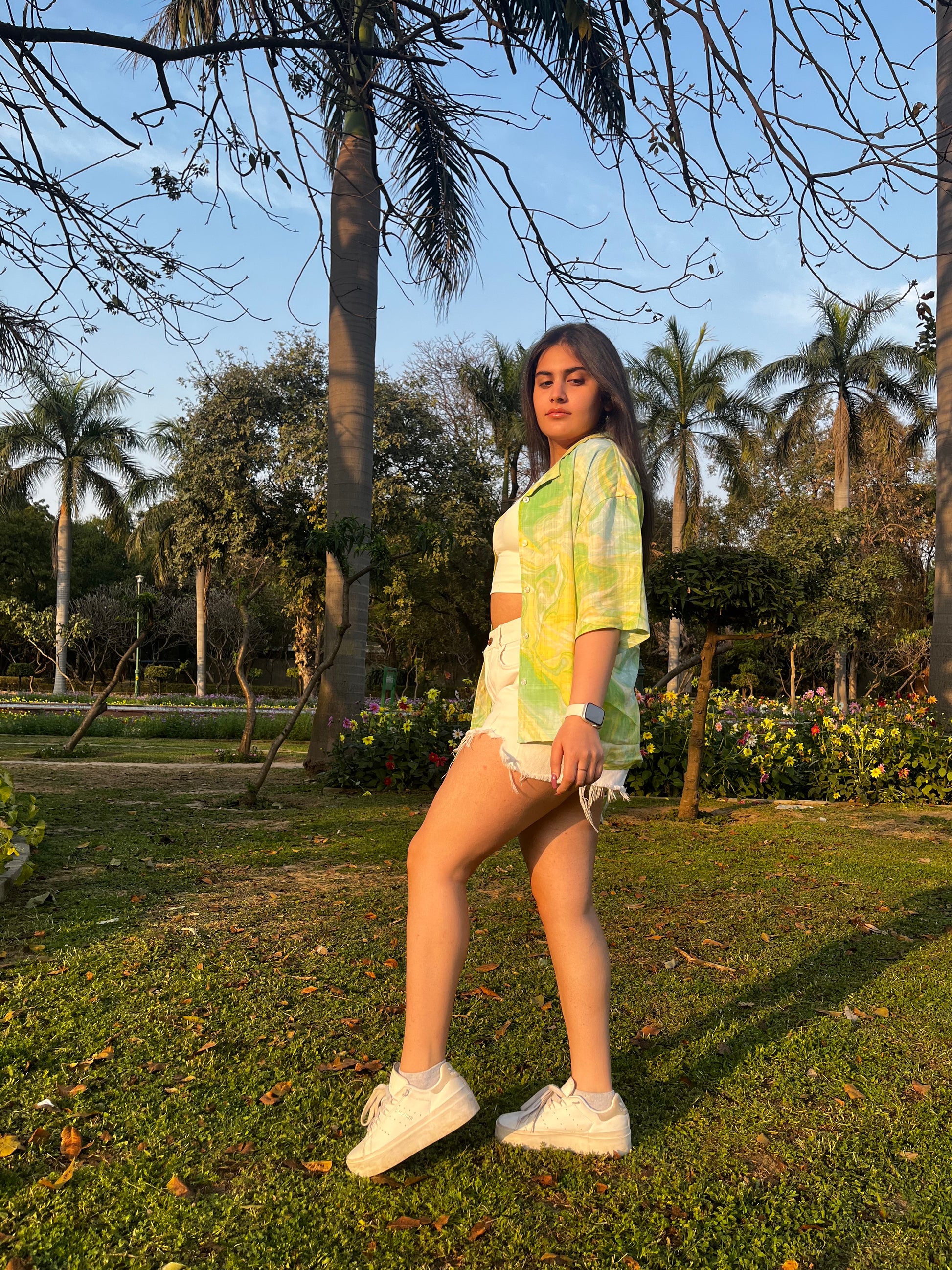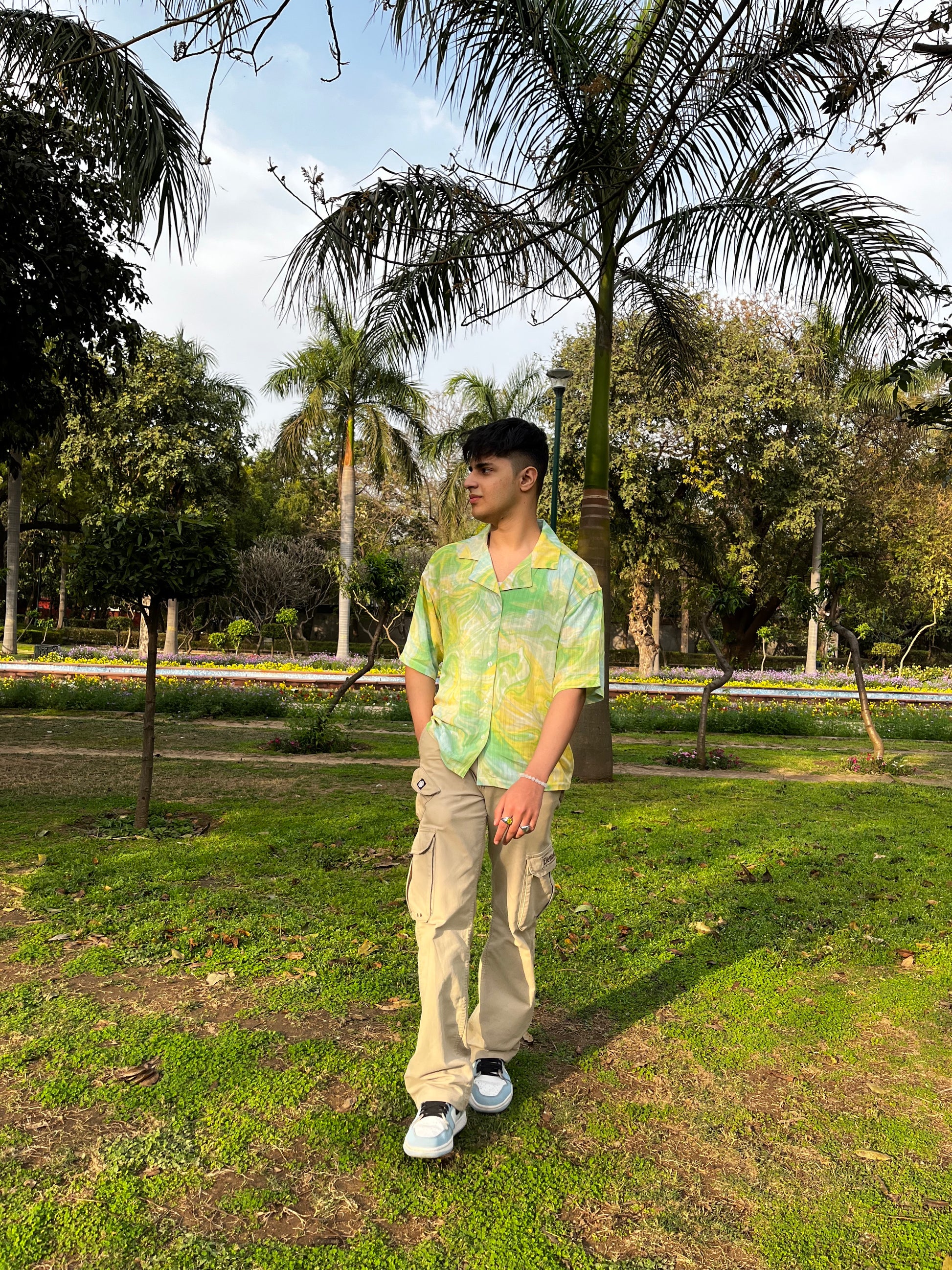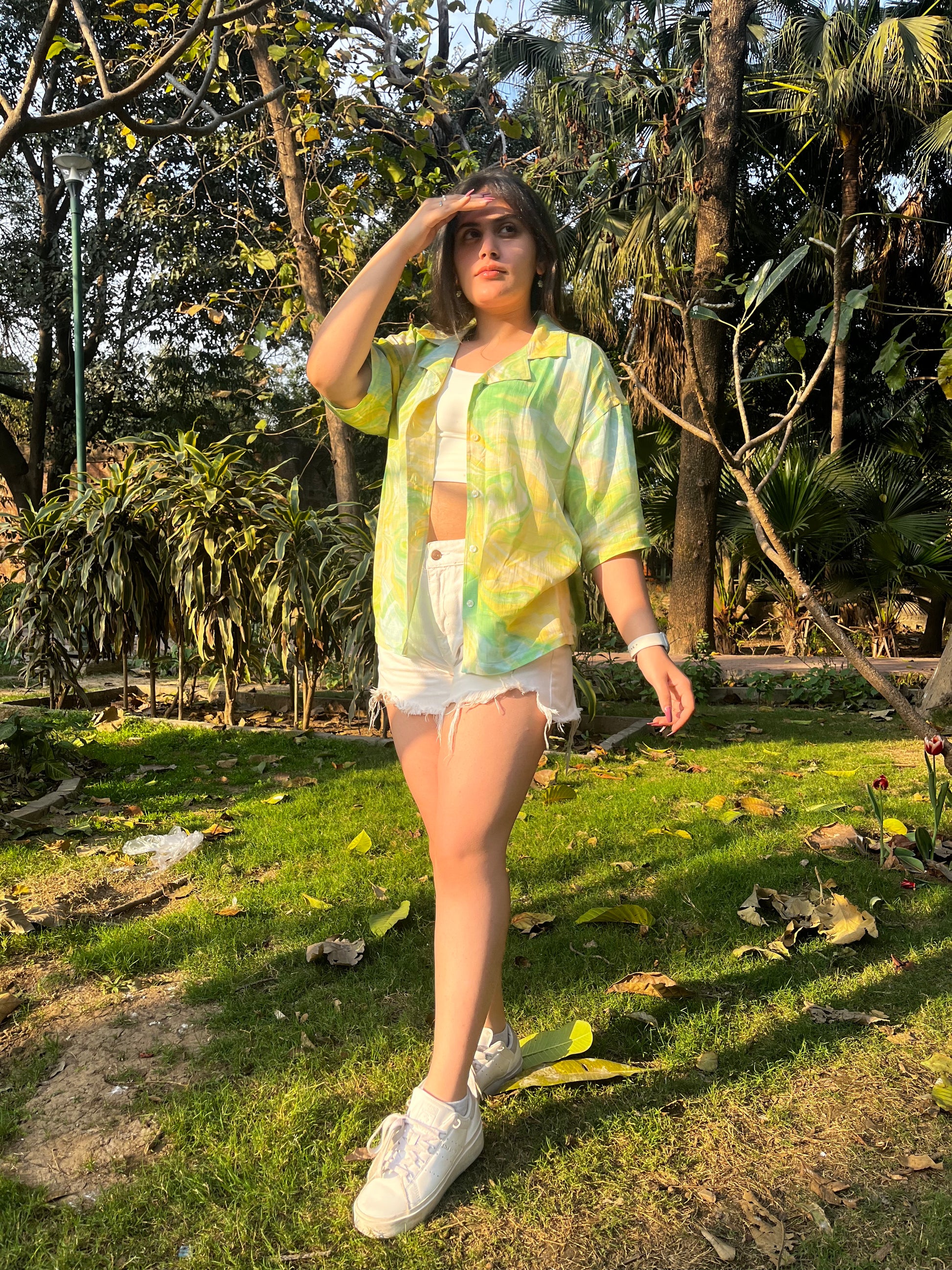 The shirt has bright and soothing marble print in shades of yellow and green; the resort collar with button down feature makes it perfect for your next vacation wear!