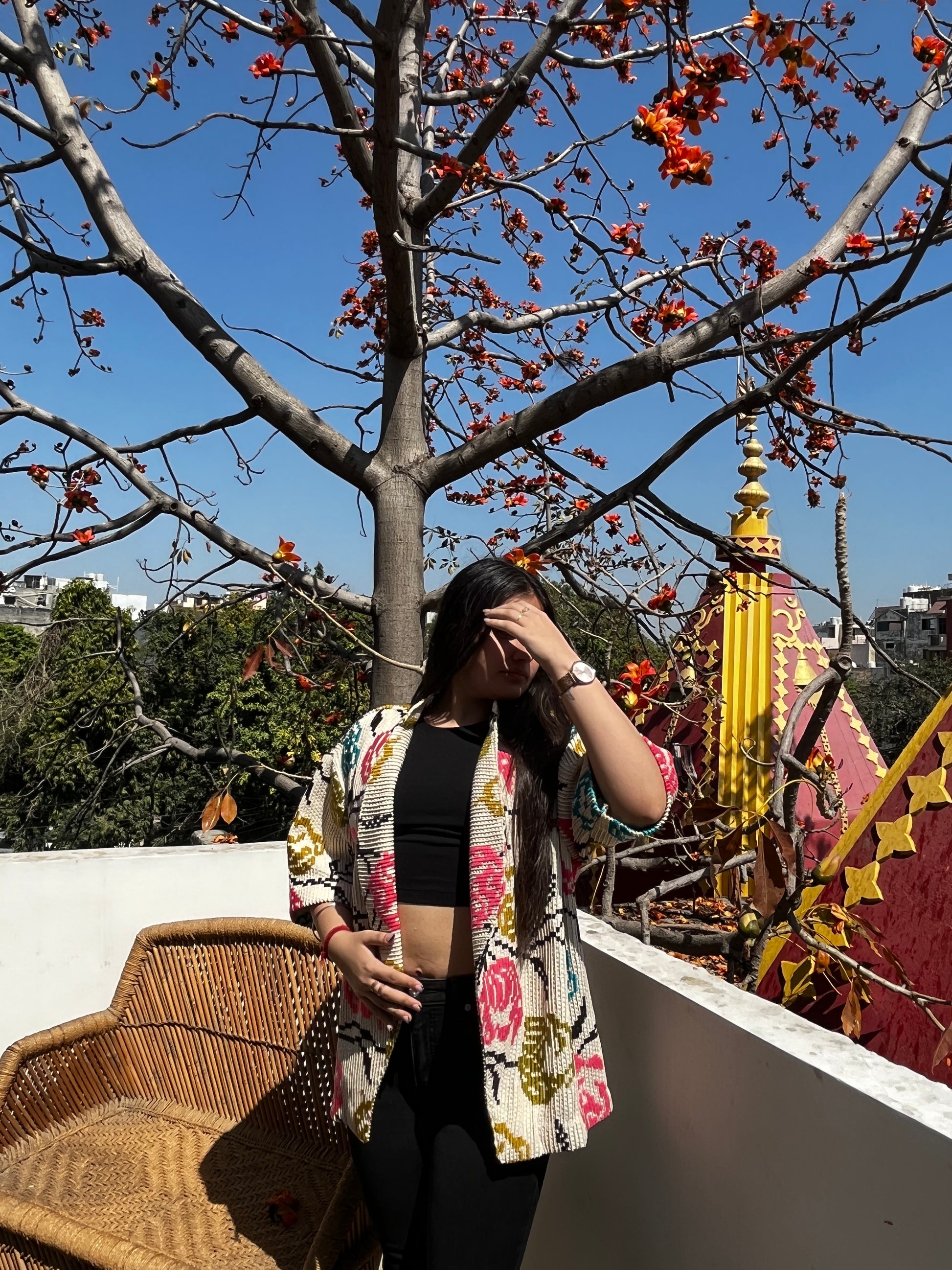 This cotton based shrug features machine embroidered floral motifs over dori work that bring texture, colour and quiet character to the silhouette. Designed for comfort and ease, the relaxed fit makes it perfect for slow days, creative work hours or styled up for evenings out!